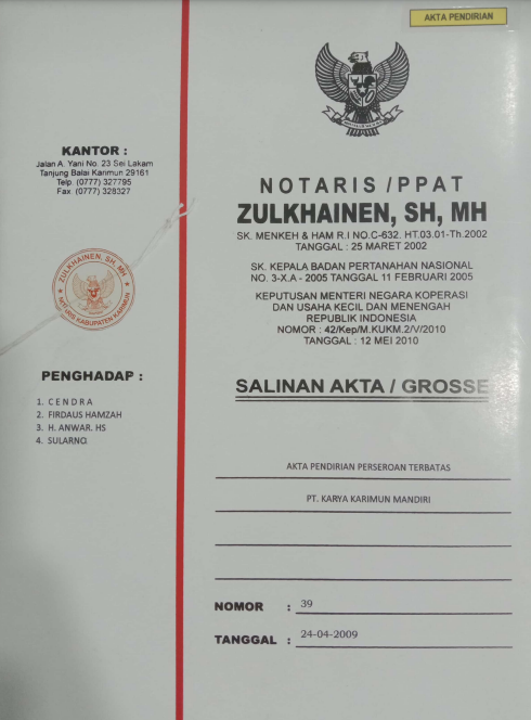 Kabupaten Karimun Berdasarkan Akta Perubahan Notaris/PPAT Zulkhainen, SH,MH Nomor 16 Tahun